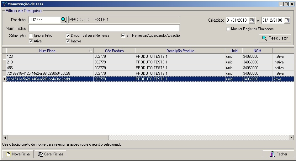 Ativa: É a FCI ativa no momento corrente. O sistema garante, via validação, que um produto tenha somente uma FCI ativa por vez. Para ser considerada ativa, a FCI tem que ter seu número preenchido.