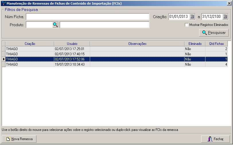 Permite criar, pesquisar, gerar e regerar arquivos para transmissão das fichas para a SEFAZ. Através do botão “Nova Remessa” é feita a seleção das fichas e geração do arquivo no formato ”.txt” a ser transmitido. Para transmissão é necessário usar os programas fornecidos pela SEFAZ de São Paulo (responsável pela hospedagem dos serviços da FCI), disponíveis para download em http://www.fazenda.sp.gov.br/fci.