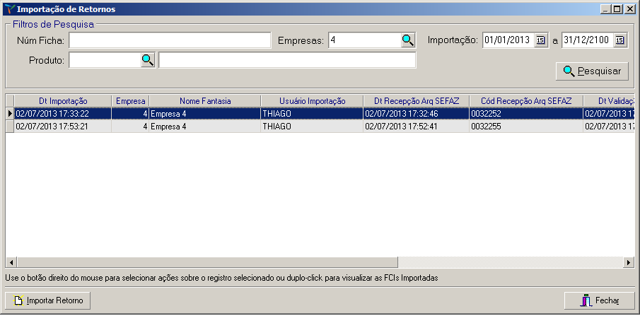 Opção utilizada para carregar o arquivo de retorno obtido no site da SEFAZ. Ao confirmar a importação, a numeração das FCIs será preenchida automaticamente e as FCIs antigas que forem encontradas serão automaticamente inativadas. O log com o resultado do processamento da importação é exibido em tela. Obs: ao importar o arquivo o sistema identifica automaticamente a empresa à qual ele pertence. Assim, a importação do retorno não precisa ser feita a partir da empresa geradora da remessa.