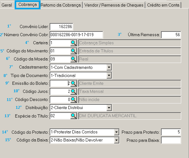 14. Código de Protesto e Prazo para Protesto: Define se o titulo será protestado pelo banco e caso afirmativo quantos dias após o vencimento será executada a operação.